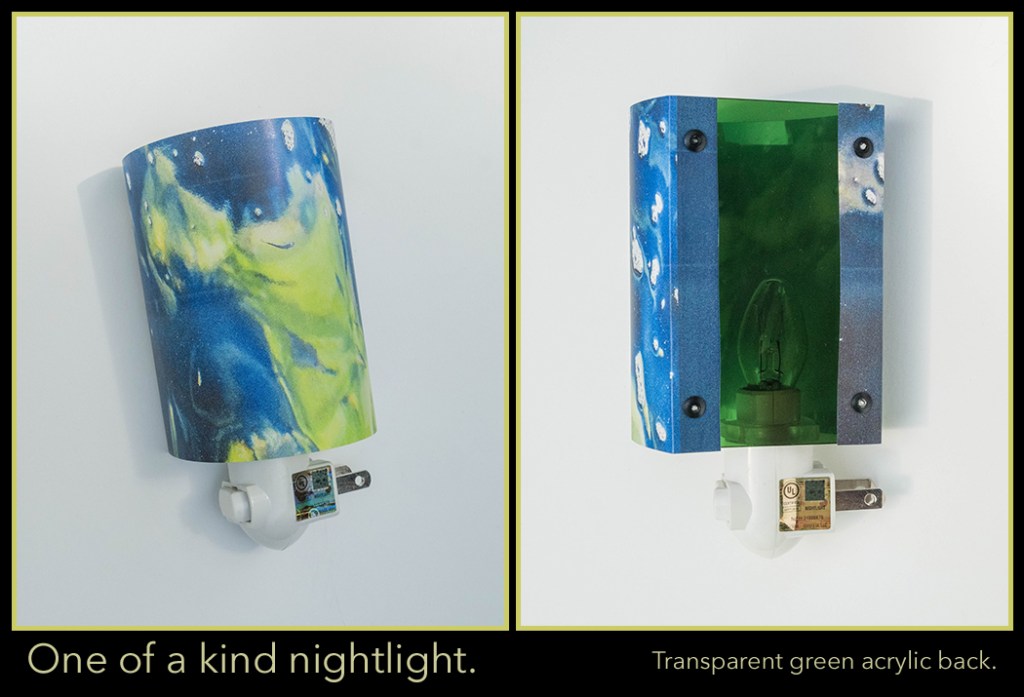 Images for the nightlights came from artist proofs of abstract underwater scenes. The proofs were printed on a heat resistant, flexible material. The acrylic backings were designed and laser cut to our specifications.