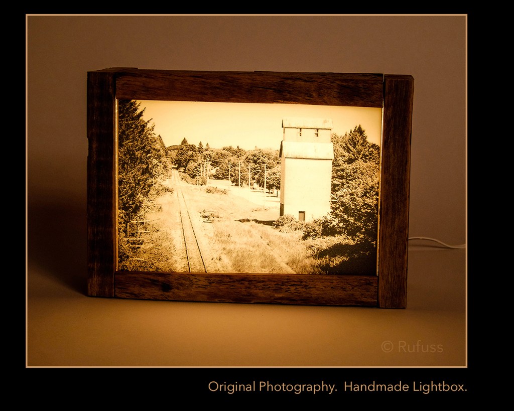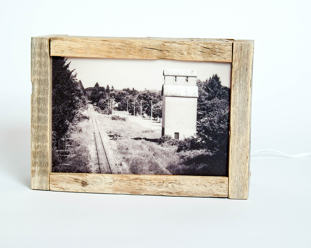 A Rufuss original. Handmade lightbox made with reclaimed pallet wood. B&W image of Ponty Pool, Ontario printed on acrylic. The warm LED’s give the photo a warm, vintage, sepia like glow during evening hours.