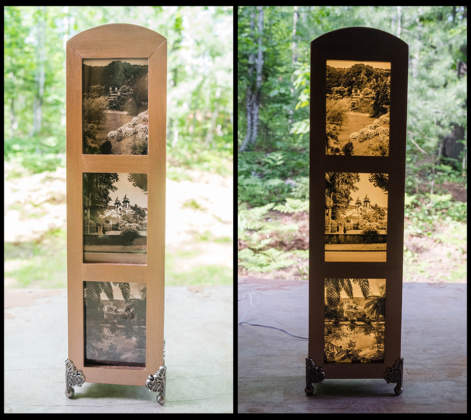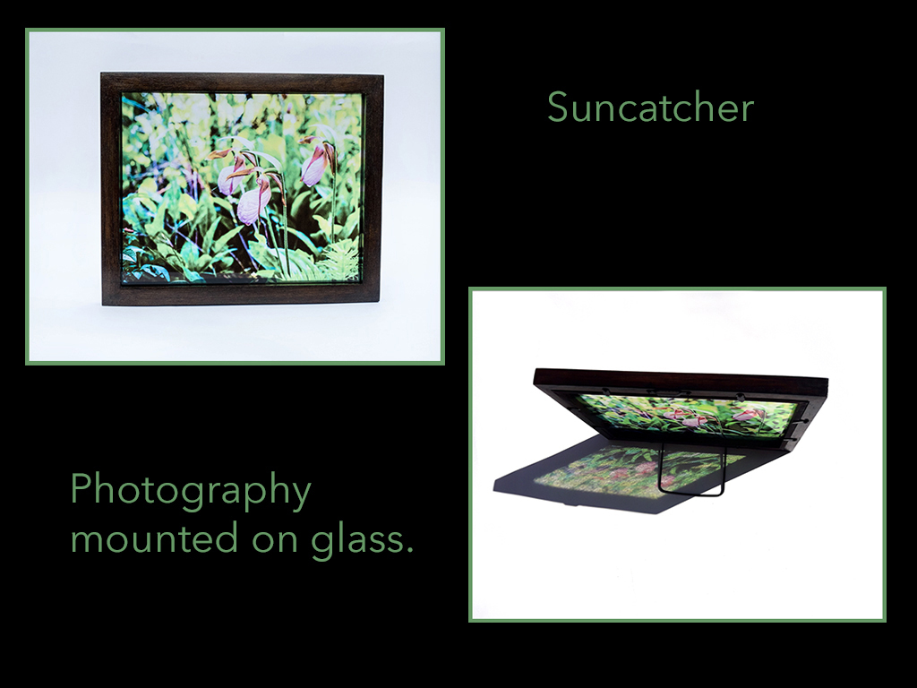 A tabletop suncatcher. The photo is printed on a commercial grade surface with UV protection. We refurbished and repaired the frame for this sun catcher.
