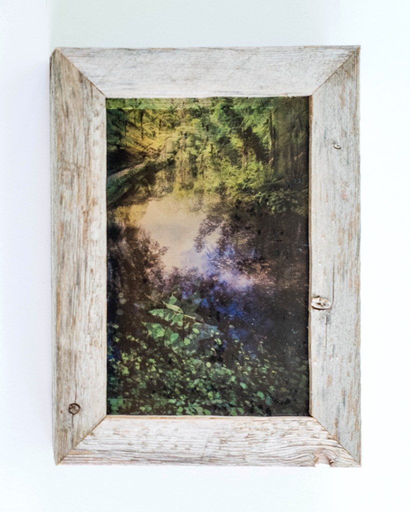 Made from reclaimed wood and a reclaimed mirror. The photo and mirror combination make Dreamy Garden very reflective. As the viewing angle changes, so do the reflections. At certain angles the viewer’s environment starts to reflect and combine with the photo. Dreamy Garden was taken at the world famous Terra Nostra Garden in Furnas, Azores. The garden scene becomes much more magical with the mirror. There are slight colour changes throughout the day as available light changes.