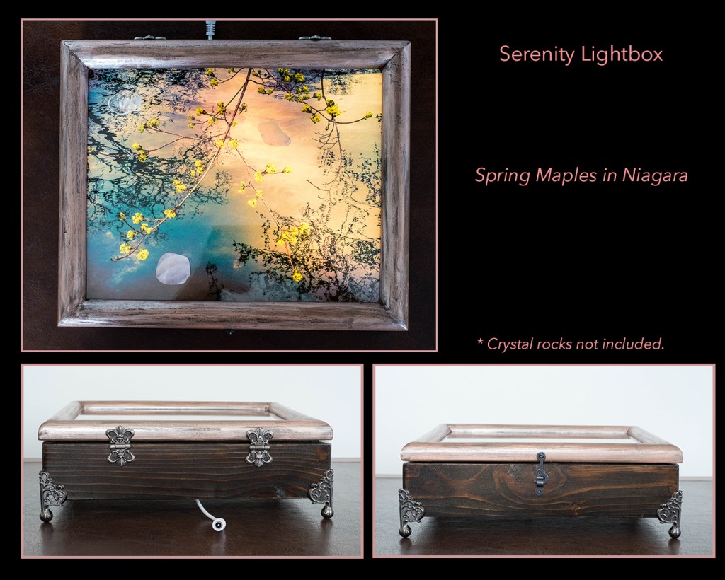 This lightbox is designed to sit flat on a table. The box and photo combination was designed for displaying small rocks or crystals on top of the image.