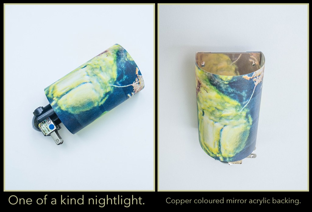 Original images on each nightlight. Photos are printed on a heat resistant material. CSA approved base. Incandescent lightbulb. Acrylic back.