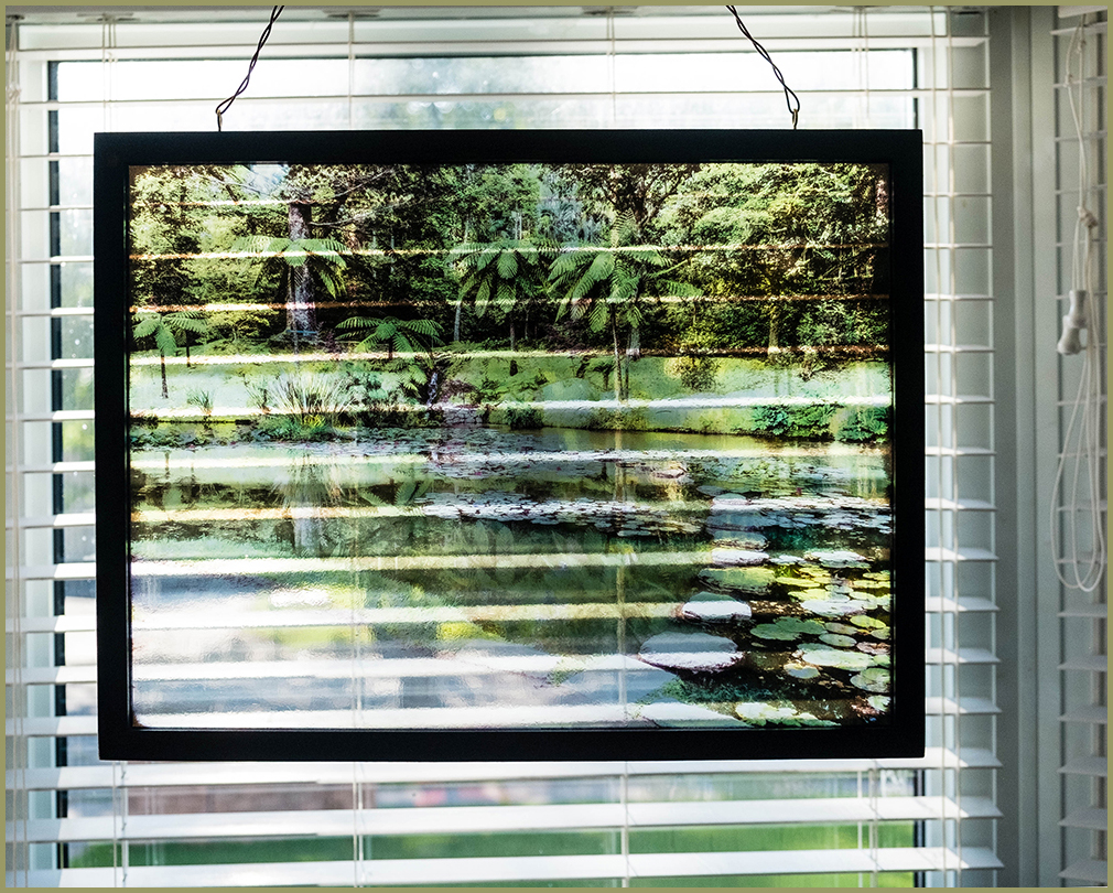 Photography mounted on glass. Printing process is designed for exposure to UV light.